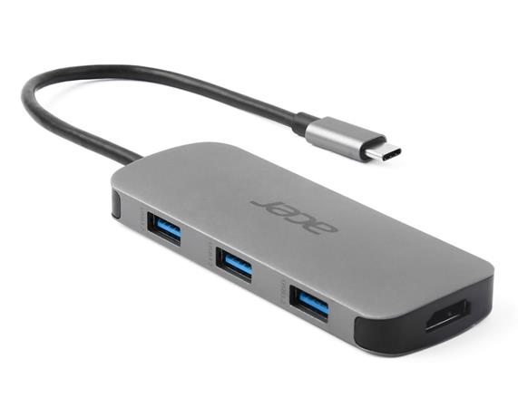 Acer 7in1 Type-C dongle: 1x HDMI (až 8K@30Hz), 3x USB-A 3.2 Gen1 (5Gbps Data Transfer), 1x SD 3.0, 1x microSD, 1x USB-C (Power Delivery max. 100W), hm. 58 g, rozměry 102 x 40 x 12,5 mm, silver