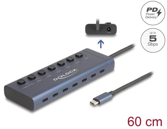 Delock USB 5 Gbps Hub se 7 porty USB Type-C™ se spínačem, z nichž 6 x datové porty a 1 x datový port s napájecím výkonem