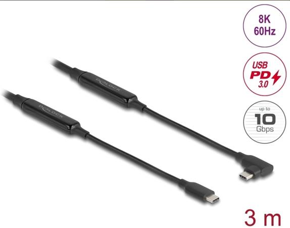 Delock Aktivní kabel USB 10 Gbps, ze zástrčkového rozhraní USB Type-C™ na zástrčkové, pravoúhlý, levý / pravý, 3 m, 8K