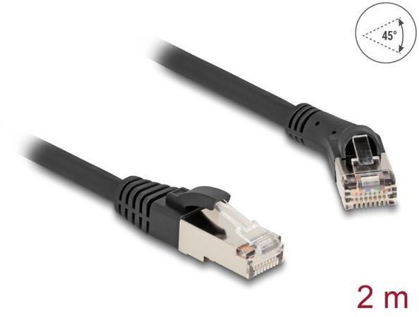 Delock Síťový kabel RJ45 Cat.8.1 S/FTP, ze zástrčky zalomené doprava 45° na přímou zástrčku, až 40 Gbps, 2 m, černý